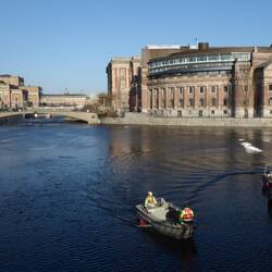 Morgens um 10:00 Uhr fand ein Bootsrennen über den Fluss, der durch Uppsala fließt, statt. Jeweils vier Studenten bauten sich hierzu ein Boot, verkleideten sich und mussten sich der Herausforderung stellen, die zwei Dämme im Fluss ohne Kentern zu überstehen. Tatsächlich kentern relativ wenige Boote, anscheinend sind die Schweden talentiert im Boote bauen! Da die Stadt komplett überfüllt war an diesem Tag, musste man sich die guten Spots am Fluss schon sehr früh sichern, weshalb ich mit meinen Freunden schon ab 8:30 Uhr am Fluss saß und das für diesen Morgen traditionelle Champagner-Frühstück genoss.