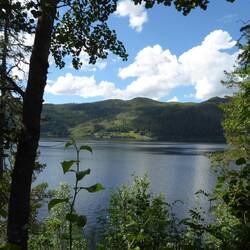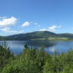 Ich fahre noch bis Montag Abend mit Cyprien mit, bis dahin müssen wir die (nur) 135 Kilometer entfernte Stadt Namsos erreichen. Dementsprechend hatten wir heute auch gar keinen Stress und fuhren einfach mal los. Landschaftlich gefiel mir die Strecke ziemlich gut! In den letzten beiden Tagen hatten sich die Berge, welche die Fjorde umgaben, von schroffen, dicht bewaldete in karge, spärlich bewaldete Berge mit runden Spitzen verwandelt. Wir fuhren weitgehend durch das Hinterland und kamen an vielen Seen vorbei.