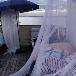 Schließlich übernachteten wir auf der Terrasse des Hauses, von der man aus eine tolle Aussicht über das Meer bis hin zu den Bergen am Horizont hatte.Leer más