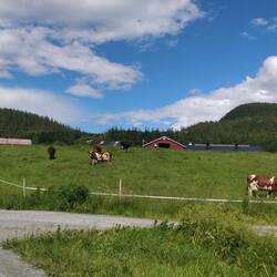 Am Dienstagmorgen trennten sich die Wege nach acht Tagen gemeinsamem Reisen von Cyprien und mir. Während er weiterhin dem EuroVelo 1 zum Nordkap folgte, fuhr ich zum 50 Kilometer entfernten Bahnhof in Grong, welcher etwas mehr im Landesinneren lag. Zunächst hatte ich mir überlegt, den einzigen Bus des Tages von unserem Übernachtungsort Namsos nach Grong zu nehmen. Da ich allerdings den ganzen Tag Zeit hatte, entschied ich mich dazu, die Strecke zu mit dem Rad zu fahren. Dies entpuppte sich als gute Entscheidung, denn die Straße nach Grong führte durch das schöne Tal Namdalen am breiten Fluss Namsen entlang - dort sah ich Wasser, Berge und Farmland mit unzähligen roten-weißen Scheunen und Kühen so weit das Auge reichte.