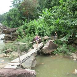 Also haben wir beschlossen, stattdessen zu einem einige Kilometer entfernten Wasserfall zu fahren und unterwegs etwas zu essen. Zu essen gefunden haben wir zwar nichts, dafür wurde der Weg dorthin ziemlich abenteuerlich. Von der Hauptstraße, die uns an Hunderten von Reisfeldern vorbei geführt hat, sind wir auf einen hügeligen Schotterweg abgebogen, der für meine wenige Stunden lange Mopedfahrerfahrungen ziemlich herausfordernd war. Am Parkplatz davor schließlich angekommen, wartete noch eine kleine Wanderung über Felsbrocken und einen Fluss, bei der wir von Stein zu Stein über dünne Holzbretter balancieren mussten, bis wir schließlich einen Wasserfall in der Ferne entdecken konnten. Viel näher konnten wir da zwar nicht hinklettern, schön sah er aber trotzdem aus.