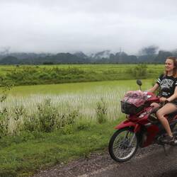 Damit hat unsere Tour auch schon gestartet: Hannah und ich voraus - ich hinten und mit Karte vom Thakek-Loop, den wir in den nächsten Tagen fahren werden, in der Hand -, Anni uns folgend haben wir die Stadt hinter uns gelassen und sind auf eine Straße abgebogen, die uns in eine atemberaubende Kulisse geführt hat: Hinter grünen Reisfeldern; kleinen Häuschen und Palmen türmten sich riesige, dunkelgraue Felsformationen auf. Diese Landschaft begleitete uns für den Rest des Tages, es wurde jedoch nie eintönig. Stattdessen war es eine der schönsten Umgebungen, in denen ich je gewesen bin. Kühe, Hunde und Ziegen, die neben einfachen Farmhäusern am Straßenrand aber vor allem auch auf den Straßen zu finden waren, machten die Strecke nur noch interessanter. Dass ich später noch selbst meine Mopedfahrkünste ausprobieren durfte, machte sie noch abenteuerlicher.