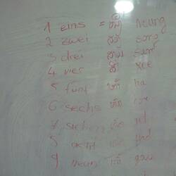 Am Dienstag hingegen haben wir die Pause genutzt, um koreanisch essen zu gehen. Währenddessen hat Soulisack versucht, uns das laotische Alphatbet näher zu bringen. Nicht nur das Schreiben ist hier eine Kunst, sondern auch die Aussprache ist total schwierig, die Buchstaben hören sich teilweise genau gleich an und wir sind fast verzweifelt, die Unterschiede festzustellen.