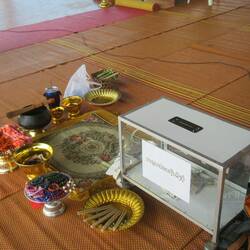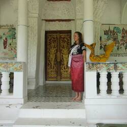 Nach dem Eintreten wurden wir freundlich von einigen Mönchen und Nonnen empfangen, die in ihren typischen orangenfarben beziehungsweise weißen Gewändern und mit abrasierten Haaren in einer kleinen Holzhütte auf dem Boden saßen und uns dort mit langen Röcken ('Sin') und einem weißen Schal, der um die Brust gewickelt wird, für den Tempelanlagenbesuch ausgestattet haben.