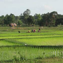 'Hotay Pidok' hieß unser heutiges Ausflugsziel. Zusammen mit einem Freund Hannahs und Annis - Soulisack - haben wir uns mit zwei Mopeds von Savannakhet aus auf den 70 Kilometer langen Weg dorthin gemacht. Landschaftlich war die Strecke wirklich toll: Wieder sind wir an Dutzenden von Reisfeldern vorbeigekommen, auf denen laotische Feldarbeiter mit den typischen runden, spitzzulaufenden Strohhüten gearbeitet haben. Am Straßenrand und auf der Straße waren überall Kühe, Ziegen und vor allem ganz viele Hunde unterwegs. In kleinen Dörfern wurde in kleinen Holzständen frisches Obst und Gemüse sowie verschiedene laotische Köstlichkeiten verkauft.