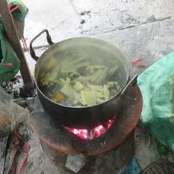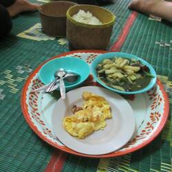 Für die Bambussuppe wurden zunächst weiße, runde Bambusstücke in dünne, mundgerechte Scheiben geschnitten. Zusammen mit einem zucchiniähnlichen Gemüse, Kürbis, Pepperonis und irgendwelchen Kräuterblättern wurden diese in einer Brühe für eine ganze Weile lang gekocht. Als das Gemüse schließlich gar war, wurde die Suppe mit 'Sticky Rice' und in unserem Fall auch mit Ei serviert, traditionell wird die Suppe zusammen mit dem Reis mit den Händen gegessen.