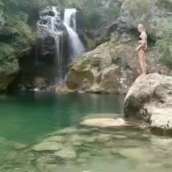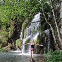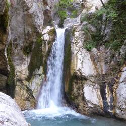 Dort wanderten wir auf einem schmalen Weg direkt neben beziehungsweise über dem Wasser eine Schlucht entlang, die von einem glasklaren, türkisblauen Fluss durchzogen wurde (natürlich wieder mit einer Menge anderen Touristen zusammen, die Highlights Sloweniens sind wohl doch nicht ganz so unbekannt). Am Ende der Schlucht trauten Linda und ich uns dann sogar noch in das wirklich eiskalte Wasser unterhalb eines Wasserfalls zu hüpfen!