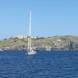 From Procida we decided to stay offshore and so to Ventotene, there appeared to be an anchoring option that was outside the Marine Park prohibited zone. Pleased we did it’s a lovely island, probably only slightly larger than Herm but more houses. In the old harbour there are now bars and other businesses in the caves the Romans had cut out of the rock. Both Ventotene and San Stefano, the offlying island were penal colonies. San Stefano still has the round prison building. Here we also saw our first Guernsey ensign on another boat, see window shot. Walking around the island we saw a beautiful church lots of cats that obviously I fed and a mini digger, look at size of seat back to get scale.Meal we ate ashore was a disappointment felt reheated and from packet but you can’t win them all and the view of the old harbour was stunning.Read more