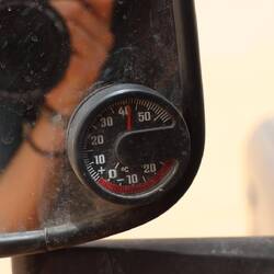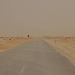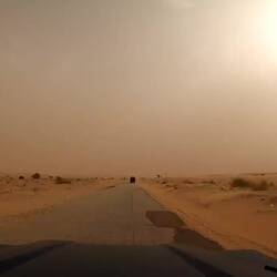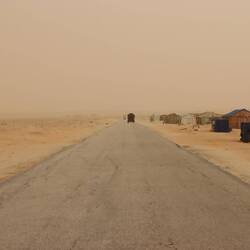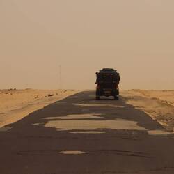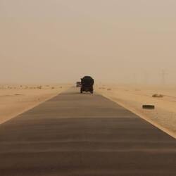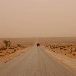 Wir wollen anschließend einen Platz in der Wüste in der Nähe der Bahnschienen finden. In Mauretanien gibt es den längsten Zug der Welt, der Eisenerz aus der Wüste an die Küste bringt, wir hoffen den Zug am Nachmittag zu sehen. Wir verlassen nach einer guten Stunde die Hauptstraße auf eine kleine Sandpiste, fahren uns sofort fest. Ich muss alles tun, um den Defender wieder frei zu bekommen. Das Außenthermometer zeigt 43 Grad, es stürmt heftig, Sand fliegt umher. Wir drehen um, entscheiden uns gegen den Zug und die noch ausstehenden 8 Kilometer Piste und fahren weiter in die Hauptstadt nach Nouakchott. Auf dem Weg: Klischeesahara mit Sandsturm, Dünen soweit ich gucken kann und unzählige Checkpoints. An jedem Checkpoint ist ein "Fiché" vorzulegen, ein kleines Stück Papier mit alles Passdaten und dem Zweck der Reise. Ich habe davon 200 Stück vorbereitet, 10 werde ich davon bereits los. Alle Checkpoints sind entspannt, niemand will Geld, bei manchen bekomme ich sogar die Hand geschüttelt. Die Stecke ist immer wieder schlecht, die Straße kaputt. Ich sehe LKW mit rund 20 vermummten Personen auf der Ladefläche, die sich versuchen gegen den Sand und den Staub zu schützen. Ab und zu gibt es kleinere Baracken, ich kann mir nicht vorstellen, wie man in einer solchen Umgebung leben kann. Auf der Fahrt von Nouadibou nach Nouakchott trinke ich rund einen Liter Wasser pro Stunde. Der Staub hat mittlerweile jede Fläche im Auto bedeckt.