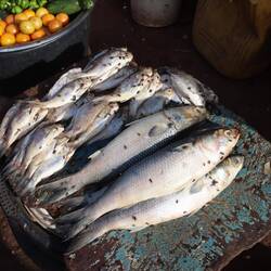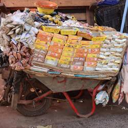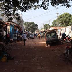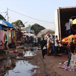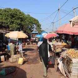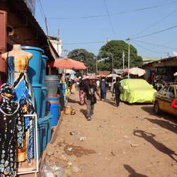 In einem Vorort von Banjul gibt es ein schönes Camp, wo Heiner im Schatten der Bäume Platz findet. Am Nachmittag lassen wir uns vom Taxi zum nahegelegenen Markt von Serekunda fahren, wo ich versuche einen neuen Rasierer zu kaufen. Offenbar ist das Auto nicht das einzige, was kaputt gehen kann. Auf dem Markt gibt es von Fisch über Plastikartikel bis hin zu Kleidung alles, außer einen Rasierer. Aufdringliche Verkäufer mit dem Satz: "do you have a shaver?" in die Irre zu führen, gelingt ganz gut.