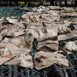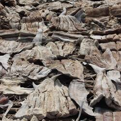 Am späten Abend dreht der Wind. Seitdem stinkt es im gesamten Camp mäßig aber regelmäßig nach Fisch. Der Geruch bleibt die ganze Nacht dezent in meiner Nase. Als wir am kommenden Morgen aufbrechen und ein paar hundert Meter durch das kleine Dorf gefahren sind, sehe ich die Quelle des Geruchs. Die Rochen, die ich am Vortag am Strand in Haufen habe verderben sehen, wurden mittlerweile auf Tischen zum Trocknen ausgebreitet. Wir laufen ein kurzes Stück durch die ausgebreiteten Fische, der Geruch ist hier um ein Vielfaches höher als im Camp.