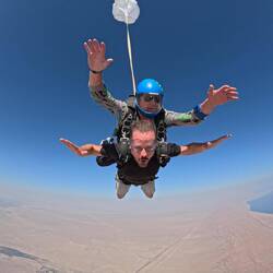 Nach so viel Abenteuer am Vormittag gehen wir es am Nachmittag etwas ruhiger an, es geht zum Skydiven. Auch wenn dies nicht mein erster Fallschirmsprung ist, muss ich gestehen, dass ich auf dem Weg zum kleinen Flughafen in der Wüste vor der Toren der Stadt nicht frei von Nervosität bin. Formalitäten wie die Sicherheitsunterweisung und die Verzichtserklärung wird erledigt, schließlich geht es in die kleine Propellermaschine, die uns innerhalb von 10 Minuten auf rund 1000 Meter Höhe bringt. Ich werde fest an den Instruktor geschnallt, bekomme die enganliegende Schutzbrille aufgezogen. Die Nervosität ist längst dem Adrenalin gewichen, besonders dann, als die Tür vom Flugzeug geöffnet wird. Wir rutschen zu zweit im Sitzen bis an die Kante, ich nehme die vorher beschriebene Haltung ein, dann springen wir. Die 35 Sekunden freier Fall sind unglaublich, unbeschreiblich. Kein Gefühl auf der Welt ist mit diesem vergleichbar. Die Belastung auf den Körper ist schließlich am Größten, wenn der Fallschirm geöffnet wird. Das anschließende Hinabsegel bis zum Boden empfinde ich als das schlechteste Gefühl des Trips, natürlich wird mir durch das Herabsegeln sehr schnell sehr schlecht, es schaukelt durch die Seitenwinde von links nach rechts. Wenn das Adrenalin nach einigen Minuten am Boden vollkommen abgeklungen ist, kann man das Glas Bier an der Theke in der kleinen Bar dann auch wieder festhalten, ohne zu zittern.