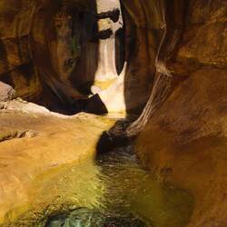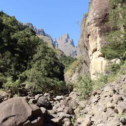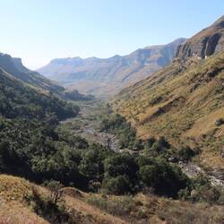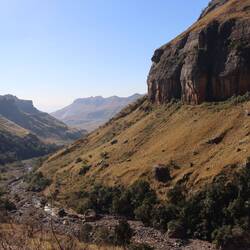 Mit dem Amphitheater und dem Tugela Falls hat der Royal-Natal Nationalpark gleich zwei erstklassige Highlights der Bergregion zu bieten und wenn man sich anstrengt schafft man es, beides in nur einem Tag zu sehen. Man muss dafür lediglich zwischen 5 und 7 Stunden wandern, je nach Tempo. Das Wetter ist hier unberechenbar, vor allem im Winter der Südhalbkugel, man kann alle vier Jahreszeiten an nur einem einzigen Tag erleben. Um das Risiko auf der recht anspruchsvollen Route zu minimieren, zahle ich einem der lokalen Wanderführer aus dem kleinen Dorf, Cesar, ein paar Euro, damit dieser mit mir läuft. Cesar ist diese Strecke schon über 100 Mal gegangen und hier aufgewachsen, kennt die Gegend und die Berge sehr gut. Es ist am Morgen frühlingshaft und frisch, wird dann aber schnell warm. Ich kann seit Wochen endlich mal wieder im T-Shirt laufen, das ging zuletzt im Norden Namibias. Das Amphitheater, so nennt sich die hohe U-förmige Bergkette, ist nach zwei Stunden zu sehen. Dann wird es schwieriger und deutlich einsamer. Cesar erzählt mir viel über Flora und Fauna und ich bin froh ihn dabei zu haben, als wir in den 'Tunnel' laufen. Die Bergkette ist hier vom Fluss des Tungela-Wasserfalls in einer Schlucht durchbrochen und um bis zum Endpunkt zu gelangen, muss diese durchquert werden. Alleine für diesen Abschnitt lohnt es sich, den ganzen Weg auf sich zu nehmen. Schließlich kommen wir an einen Ort, von dem man den Wasserfall gut sehen kann. Der Tungela-Fall ist seit 2021, wo es eine Flut im Tal gegeben hat, der höchste Wasserfall der Welt, hat sogar den Angel Falls in Venezuela abgelöst und ist seitdem angeblich vier Meter höher. Leider ist es Winter und der Wasserfall komplett trocken. "Im Sommer" so Cesar "ist er zwar zu sehen, dann kann man aber nicht durch das Flussbett. Das Wasser steht zu hoch." Auch wenn der höchste Wasserfall der Welt gerade gar keiner ist, war es die Mühe wert.
