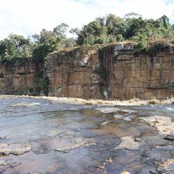 Ich lasse das Auto heute nach langer Zeit endlich mal wieder stehen und mache mich zu Fuß auf den Weg zum Magwa-Wasserfall. Louis erklärt mir, wo ich langgehen muss und welche Ecken ich eher meiden soll, die größte Gefahr sind die Hunde im Dorf, die mich natürlich nicht kennen und schonmal aggressiv sein können. Also laufe ich die Stunde bis zum Wasserfall alleine, immer direkt an der Abbruchkante entlang und so gut es geht ums Dorf herum. Am Ende der tiefen Schlucht fällt der Wasserfall mit fast 150 Metern Höhe in die Tiefe der Schlucht. Die Regierung hat irgendwann einmal einen Picknickplatz hier errichtet, der von niemandem genutzt wird. Der Wasserfall ist zu schwierig zu erreichen, die Gegend nicht die beste, große Städte liegen eine Tagesreise entfernt, allein für die letzten 20 Kilometer braucht man eine Stunde. Also verkommt der Picknickplatz mit bester Sicht auf den Wasserfall mittlerweile, ist nur noch eine überwucherte Ruine, ein Lost Place. Ich treffe am Wasserfall auf einen Hirten aus dem Dorf, plaudere kurz mit ihm, schließlich zeigt er mir einen Weg über den Fluss auf die andere Seite der Schlucht. Er erklärt mir, dass vor vielen Jahren plötzlich ein Fahrzeug in die Schlucht gefallen ist, die Überreste sind noch gut zu sehen. Niemand weiß, wer das Fahrzeug gefahren hat oder wer genau hinterm Steuer gesessen hat, vor allem aber nicht wie derjenige es geschafft hat, über wegloses, anspruchsvolles Terrain bis zur Abbruchkante zu fahren und dann auch noch herunterzufallen. Selbst zu Fuß war das schon nicht ohne.