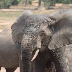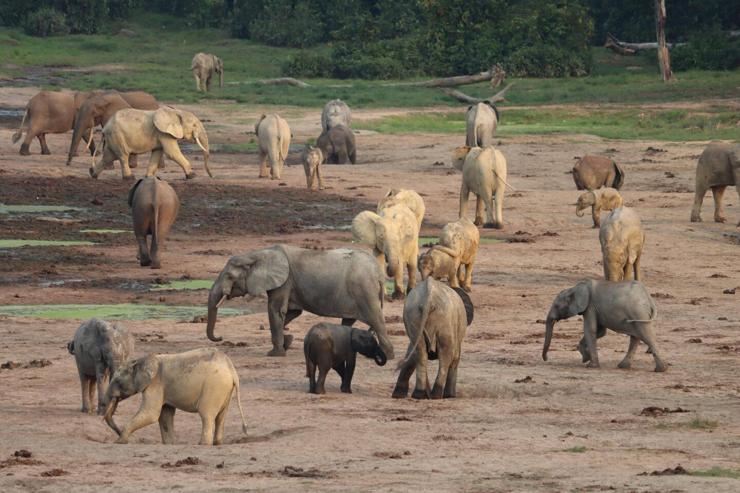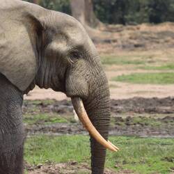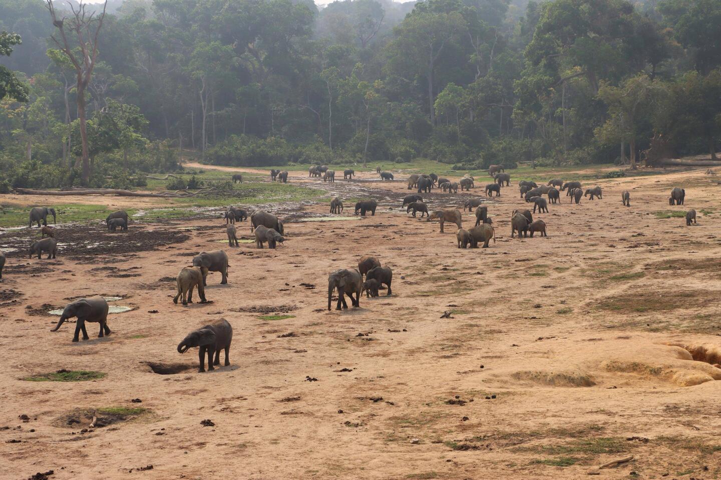 Nachdem sich der Nebel am Morgen irgendwann verzogen hat, machen wir uns auf zur Dzanga Bai, dem eigentlichen Highlight des Parks. Die Dzanga Bai ist die größte Lichtung und durch das viele Salz, was im Boden ist, kommen die Waldelefanten hier sehr gerne hin um das Salz aus dem Boden aufzunehmen. Wir fahren ein kurzes Stück, dann bekomme ich Instruktionen wie ich mich bei einer Begegnung mit einem Elefanten auf dem Weg zur Bai zu verhalten habe. Dann laufen wir ungefähr 45 Minuten durch den dichten Regenwald. Wir überqueren den Dzanga zu Fuß, glücklicherweise ist der zweite Fluss, der dem Nationalpark seinen Namen gibt, aufgrund der noch nicht richtig begonnenen Regenzeit hier nur etwa knietief. Als wir schließlich weiter durch den Wald laufen stoppen beide Ranger abrupt. Rund 20 Meter vor uns bewegen sich die Äste und ich sehe einen Rüssel im Dickicht. Wie gut, dass ich die Instruktionen genau befolge und statt stehen zu bleiben reflexartig versuche rückwärts zu laufen. Leonce hält mich fest, keiner spricht mehr, der Elefant schaut uns an und wir ihn. Wir sind definitiv viel zu nah dran, selbst im Kölner Zoo ist mehr Abstand zu den Elefanten und da ist noch ein Zaun dazwischen. Weder mir, noch dem Elefanten ist heute nach Konfrontation und so dreht er sich nach einigen Sekunden weg und verschwindet in den dichten Wald. Da hat er aber Glück gehabt!