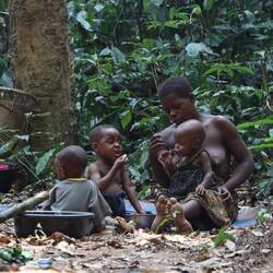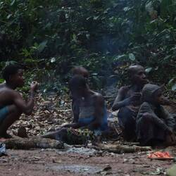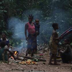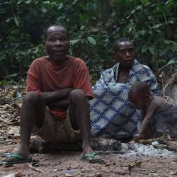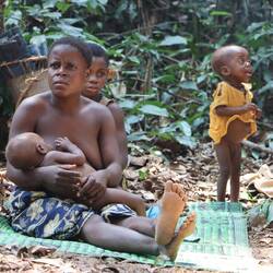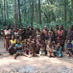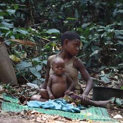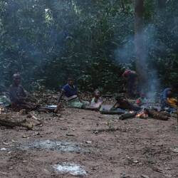 Ich leihe mir am Vormittag Zelt, Thermomatte und Decke und fahre gemeinsam mit Leonce rund zwei Stunden weiter in den Süden, raus aus dem Kern des Nationalparks. Tief im Wald gibt es noch einzelne Pygmäenvölker und eines davon ist unser Ziel. Die Pygmäen, die wir besuchen sind vom Volk der Baaka, eines der letzten Eingeborenenvölker Zentralafrikas die vollkommen abseits der restlichen Zivilisation im Wald leben. Natürlich müssen wir im Dorf noch gefühlt 30 Leute mitnehmen, die alle auf der Ladefläche Platz finden. Schon auf der Ladefläche wird gesungen und getrommelt. Wir steigen irgendwann aus dem Auto, rundum Kilometer nichts als dichter Urwald. Wir laufen weitere 20 Minuten zu einer kleinen Lichtung, hier halten sich die Baaka auf. Der Preis dafür, dass ich die Nacht hier im Zelt verbringen darf, ist eine Stange Zigaretten, Zucker und Kaffee, Leonce weiß genau, was gebraucht wird. Während ich mein Zelt aufschlage, bauen einzelne der rund 50 Personen die hier leben eine ihrer Hütten aus Blättern, die meisten schlafen außerhalb der Regenzeit unter freiem Himmel. Wir essen gemeinsam Maniok mit einer Soße aus Blättern und Erdnüssen, schließlich beginnt die Jagd der Baaka. Die Jäger stellen sich auf und anschließend probiert man Antilopen im Wald mit Netzen zu fangen. Diese Methode der Jagt ist hochspezialisiert und wird hier von Generation zu Generation weitergegeben. Frauen und Männer jagen zeitgleich und damit die Jagd im dichten Wald einfacher ist, haben alle Frauen kurzgeschorene Haare. So richtig verstehen, wer hier welche Aufgabe hat tue ich nicht, aber irgendwie schaffen es die Baaka eine der kleinen Antilopen aus dem Wald zu scheuchen, diese verfängt sich dann in einem der aufgestellten Netze. Es wird nicht jedes Mal etwas gefangen, also ist die Freude groß. Die Antilope wird ohne Hilfsmittel, also mit bloßer Hand umgebracht. Die Jagd der Baaka begleiten zu dürfen ist sicherlich keine Touristenveranstaltung und eines der authentischsten Erfahrungen dieser Reise.