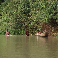 Nachdem die Antilope am Nachmittag zerteilt und gegrillt wurde, geht es an den Fluss. Auch hier hat man eine Technik, die kleinen Fische die im Uferbereich schwimmen zu fangen. Es wird ein Damm errichtet, dann das Wasser aus dem entstandenen Bassin geschöpft, anschließend können die kleinen schleimigen Fische aufgesammelt werden.