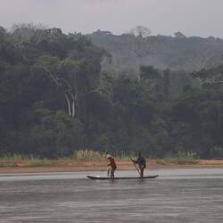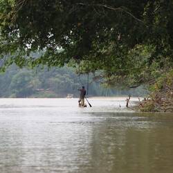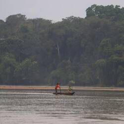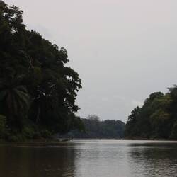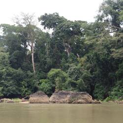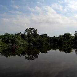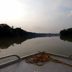 Wir fahren noch eine weitere Stunde auf dem Fluss, dessen Wasser stellenweise pechschwarz und dessen Ufer dicht bewachsen sind.