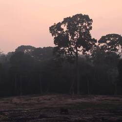 Ich habe noch immer das Zelt und die Ausrüstung, also fahre ich mit Leonce am Nachmittag noch einmal zur Dzanga Bai. Am Ufer des Dzanga-Flusses, den wir auch heute wieder zu Fuß durchqueren sitzen am Nachmittag tausende Schmetterlinge in allen möglichen Farben. Auf der Lichtung sind auch heute wieder genauso viele Elefanten anwesend wie noch vor zwei Tagen, das Licht am Nachmittag lässt die Szenerie jedoch noch einmal anders wirken. Wir schlagen unsere beiden Zelte direkt auf dem Hochstand auf, während die Elefanten unten das übliche Spiel veranstalten. Niemand sonst ist anwesend, außer den Elefanten, den Büffeln und einer Milliarde Schwarzfliegen. Nichts hilft außer sich komplett zu bedecken. Sich bei 30 Grad Handschuhe zu wünschen hatte ich auch noch nie. Immerhin verschwinden die Quälgeister am Abend, überlassen das Feld den Moskitos.