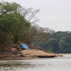 Plötzlich zieht ein Sturm auf - ja, es ist noch immer Regenzeit. Aus dem Wald rennen von überall Goldgräber ins Tal, wir mittendrin. Es schüttet bereits, als wir eine der vielen Bars erreichen. Wir müssen uns unterstellen, es stürmt, blitzt und donnert. Nach dem Regen rennen die Goldgräber, die sich mit uns untergestellt haben direkt wieder raus, die Chance ist hoch, dass der Regen jetzt Goldklumpen aus dem Wald schwemmt, die dann direkt auf der Lehmstraße liegen könnten. Ich suche natürlich mit, finde aber zum Glück keinen. Schließlich möchte ich den Ort übermorgen verlassen, ohne dass ein Kopfgeld auf mich angesetzt ist.Læs mere