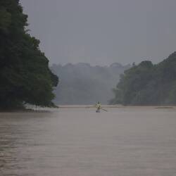 Die Nacht ist um 4 Uhr zu Ende. In der Ferne zieht ein Gewitter auf und da die Zimmer der Lodge keine Scheiben an den Fenstern haben, schläft man quasi draußen. Es blitzt und donnert noch tief in der Nacht, dann kommt der Regen - und was für einer. Mir ist direkt klar, das die Rückfahrt mit dem Boot spannend werden kann, falls es nicht aufhört. Das Boot hat kein Dach. Ich habe eine gute Regenausrüstung dabei, wasserdichte Schuhe, Hose, Jacke, alles wird angezogen. Ich packe den Rucksack in den Regenschutz und alles an Elektronik in den wasserdichten Packsack. Der Rest kann ruhig nass werden. Ich verlasse das Zimmer und stelle nach den ersten Metern fest: der Regen ist noch viel schlimmer als er sich angehört hat. Es schüttet, so wie ich es früher in der Schule im Erdkundeunterricht auf Bildern über den Regenwald gesehen habe. Alles was nicht wasserdicht verpackt ist, ist schon nach 100 Metern bis zum Bootsanleger komplett nass. Es ist noch dunkel, ich stelle mich am Bootsanleger unter und ich weiß eigentlich schon, dass wir so nicht losfahren können. Kapitän Ugor kommt kurze Zeit später, stellt sich ebenfalls unter und sagt mir, wir müssen warten bis der Regen aufhört. Wir haben ungefähr 10 Stunden Fahrt vor uns und ich plane schon eine Zwischenübernachtung irgendwo auf der Strecke, es gibt zwei schäbige Gästehäuser auf ungefähr der Hälfte. Nach zwei Stunden Wartezeit wird der Regen plötzlich weniger, Ugor macht jetzt Druck, er will losfahren. Ich werfe alles ins Boot während er mit einer abgeschnitten Plastikflasche gefühlte hundert Liter Regenwasser aus dem Boot schöpft, anschließend starten wir. Es wird heller und heller, der Regen hört auf und dadurch, dass der Sangha jetzt viel mehr Wasser führt müssen so gut wie keine Sandbänke mehr umfahren werden. Wir verlassen die Zentralafrikanische Republik und es zieht sich wieder zu. Hinter uns sehe ich es schon wieder heftig auf den Sangha regnen, Ugor gibt Vollgas um vor dem Regen zu fliehen aber auch von vorne ziehen tiefschwarze Gewitterwolken auf, schließlich fängt es wieder an zu schütten. Wir fahren schon halb durchnässt die letzten Meter bis zur Grenzstation der Republik Kongo, Ugor wirft die Regenschutzplane über alle Sachen, er holt sogar seine 200 Stangen Zigaretten, die er gerade nach Kongo schmuggelt, aus dem doppelten Boden der Sitzbank nach vorne unter die Plane. Wir beide kriechen ebenfalls unter besagte Plane und warten erstmal ab. Wasser läuft überall ins Boot, so richtig trocken bleibt eigentlich nur die Elektronik im wasserdichten Packsack. Nach einer Stunde ist der Regen auf einem normalen Niveau und wir können das Boot verlassen. Ugor möchte sich gerne die 5000 Franc (7.50€) sparen, die man hier bei dem korrupten Polizisten als Gegenleistung für den Stempel abgeben muss, also sagt er mir, ich soll unter der Plane bleiben. Wir holen den Stempel dann später in Ouesso, da will keiner Schmiergeld. Leider kommt der Grenzbeamte runter zum Boot und ist nicht unbedingt erfreut als er sieht, dass wir zu zweit sind. Er schimpft mit Ugor und fragt mich, wieso ich nicht mit zum Büro gekommen bin. "Ich habe auf die Sachen aufgepasst" schwindel ich schnell, so richtig glauben tut er das nicht, aber immerhin stempelt er im Anschluss im Büro meinen Pass. "Normalerweise kostet das 5000 Franc, weil es so regnet lasse ich euch heute mal so fahren." Na da haben wir aber Glück mit dem Wetter.