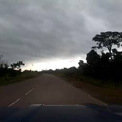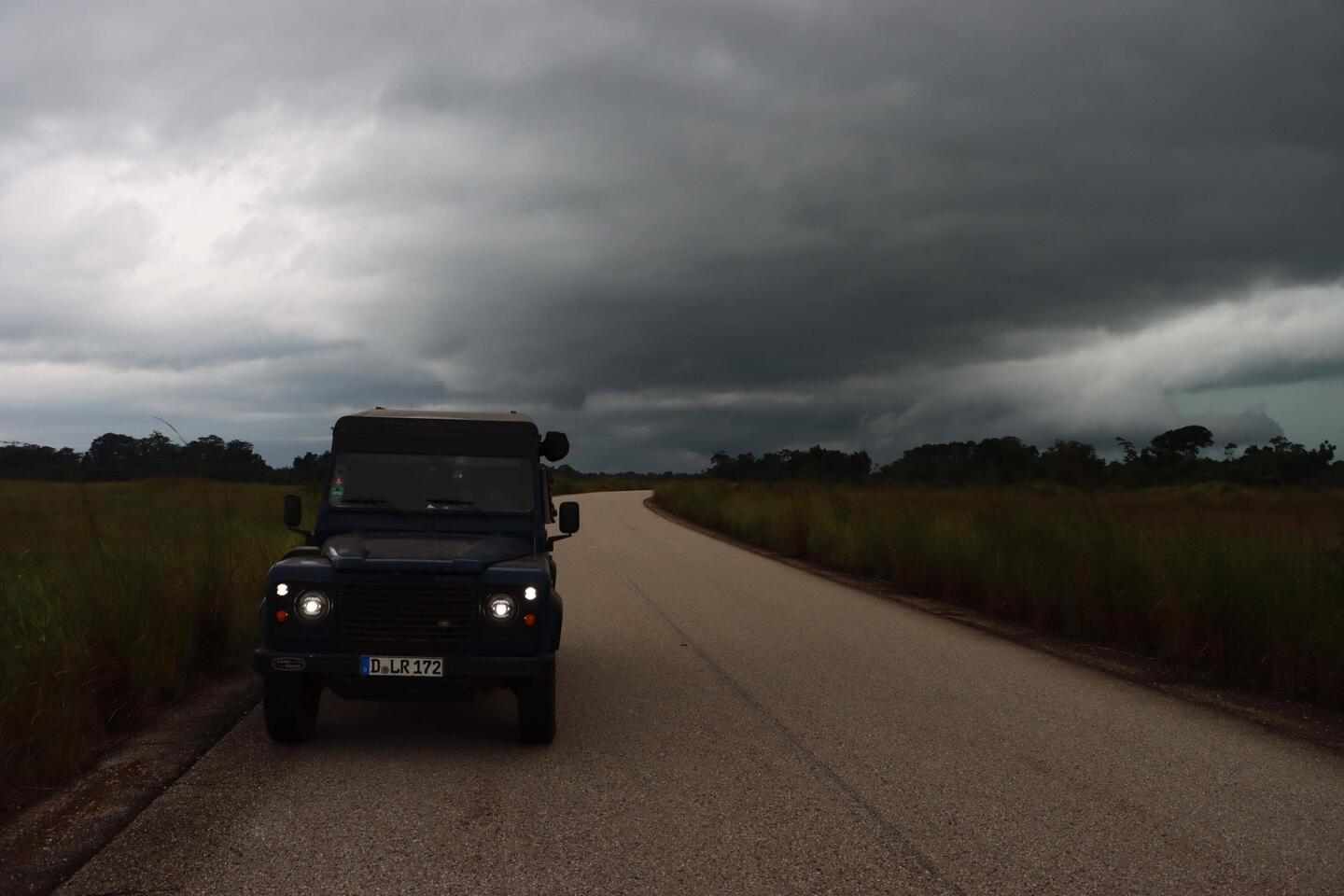 Am nächsten Morgen geht es weiter, die Republik Kongo zieht sich länger als ich vorher gedacht habe und so steht heute wieder ein ganzer Fahrtag an. Die Landschaft bleibt spektakulär, weite Flächen bewachsen mit dichtem Gras und einzelnen Bäumen. In der Ferne ziehen pechschwarze Regenwolken auf, was die ganze Szenerie noch eindrucksvoller macht als die vielen Wochen wolkenfreier Himmel. An der Straße gibt es immer mal wieder einen Schwarzmarkt mit Benzin aus Fässern, falls irgendwann mal eine Tankstelle Diesel oder Benzin hat, wird dieser von den Anwohnern direkt leergekauft und anschließend für den doppelten Preis an der Straße angeboten. Auf dem Schwarzmarkt gibt es auch heute nur Benzin, keinen Diesel. Ich halte an jeder Tankstelle an, die es auf dem Weg gibt, auch an denen die abgesperrt sind und frage nach Diesel, oft werde ich schon von weitem weitergewunken. Jeder sagt das gleiche: "In der nächsten Stadt gibt es welchen" ist dann aber nicht so. An einem Checkpoint werde ich angehalten, diesmal nicht um meinen Pass zu zeigen, sondern um eine junge Frau mit ihrem Kind mit ins nächste Dorf zu nehmen. Ich spüre, dass der Regen kurz davor ist anzufangen, also nehme ich die beiden mit. Als sie im nächsten Dorf aussteigen fängt es an zu schütten. Der Scheibenwischer läuft rund 10 Sekunden auf maximaler Stufe als plötzlich die Plastikaufhängung eines der beiden Scheibenwischerbläter bricht. Ich muss anhalten und bei strömendem Regen aussteigen, der Schirm hat bei dem Sturm überhaupt keine Wirkung, innerhalb von Sekunden bin ich komplett nass. Damit ich wenigstens weiterfahren kann reiße ich das gesamte Wischerblatt ab und fahre total durchnässt erstmal nur mit einem Scheibenwischer weiter. Irgendwann kommt eine Tankstelle, es gibt natürlich auch hier keinen Diesel aber wenigstens ein Dach. Ich habe drei Ersatzscheibenwischer dabei und auch drei neue Plastikhalter, bekomme an der Tankstelle alles repariert. Kurze Zeit später sehe ich an einer weiteren Tankstelle ein Fahrzeug tanken. Es gibt tatsächlich Diesel! Nachdem ich in der Republik Kongo eine Strecke gefahren bin, die soweit ist wie von Hamburg nach München gibt es hier tatsächlich den ersten Diesel, ich habe an jeder einzelnen Tankstelle bis hierher gefragt. Ich fülle alles auf und finde kurze Zeit später eine Bank, deren Automat tatsächlich auch noch Geld ausgibt. Auch finde ich eine Ananas am Straßenrand, die Versorgung wird für mich also langsam besser. Bisher empfinde ich die Versorgungslage in der Republik Kongo als die schlechteste von ganz Afrika, es mangelt an allem.