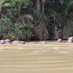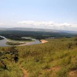 Schließlich verlassen wir das Boot und besteigen einen der Berge am Flussufer. Während der Ranger barfuß läuft, die ganze Zeit telefoniert und oben nicht einmal außer Atem scheint, brauche ich als wir endlich oben ankommen fast eine Herz-Lungen Maschine. 6 Monate im Auto rächen sich jetzt. Immerhin lohnt sich die Ackerei, der Blick vom Gipfel auf den Fluss und die weite bewaldete Steppe ist traumhaft. Auf dem Rückweg zum Camp sehen wir noch eine Gruppe Flusspferde im Wasser. Der Ranger reagiert recht hektisch und gibt Vollgas, er sagt mir, dass Flusspferde auch für uns auf dem Boot sehr gefährlich sein können. Angst vor Wasser, wie der Gorilla, haben sie in jedem Fall nicht.Læs mere