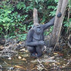 Am Morgen sind drei Ranger im Camp. Wir besprechen kurz, wie der Tag ablaufen kann, anschließend fahre ich mit einem der Dreien mit dem Schnellboot über den Fluss. Wir haben Bananen, Ananas und Aubergine an Bord und die drei Gorillas, die auf den Inseln rund um den Fluss leben wissen das natürlich. Plötzlich steht er am Ufer. 300 Kilo, schwarze Haare, silberner Rücken. Der erste westliche Flachlandgorilla den ich in meinem Leben außerhalb eines Zoos sehe. Was für eine Erscheinung, sein Geruch und seine Körperhaltung sind fast schon angsteinflößend. Wir fahren ziemlich nah mit dem Boot an die Insel, der Gorilla ist keine 3 Meter mehr entfernt. An Bord kommen kann er nicht, Gorillas haben Angst vor Wasser. Er grunzt, will jetzt endlich eine Aubergine haben, schließlich hat er extra hier am Ufer auf uns gewartet. Er bekommt seine Aubergine, ich dafür ein Foto von ihm. Auch die anderen beiden Gorillas sehen wir später, nicht ganz so nahe aber trotzdem noch total beeindruckend.