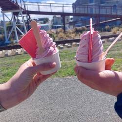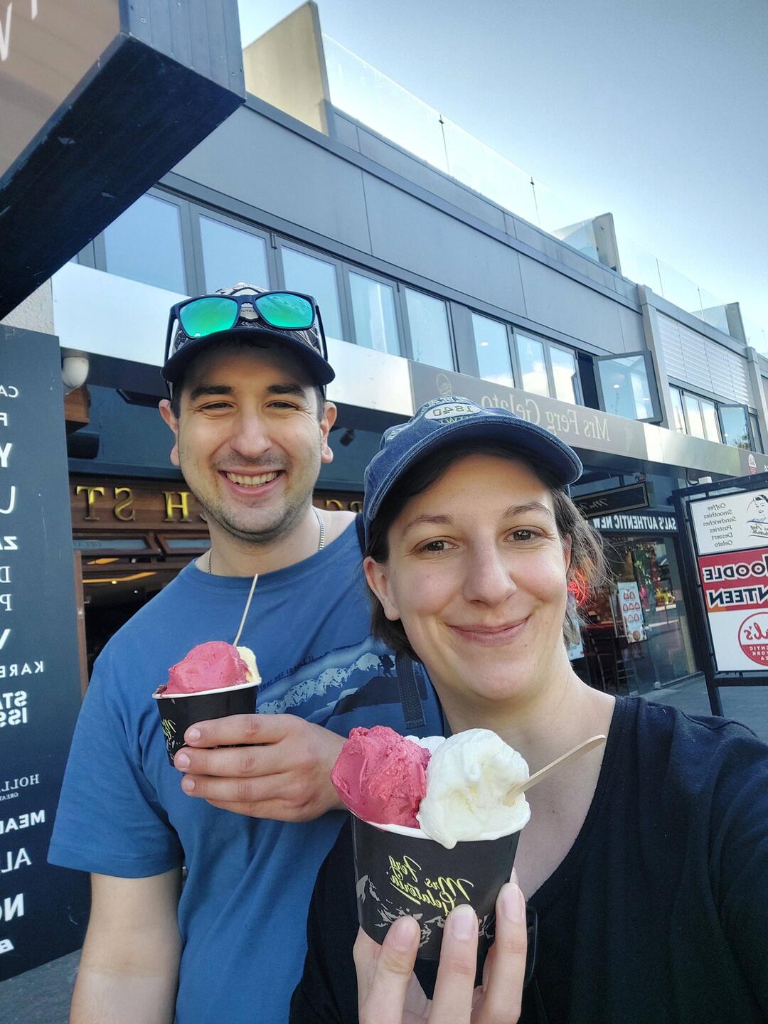 Weil wir von unser Action Erlebnis und den sexy Neopren Anzügen noch keine Fotos haben gibt es hier unser wohlverdientes Überleben/Sieger Glace und ganz viele süsse Holzmännchen vom Campingplatz in Arrowtown.