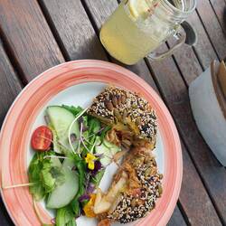Nach einem kurzen Strandspaziergang, gönnten wir uns einen Bagel im Örtlichen Kaffee, welches von einer Schweizerin geführt wird.