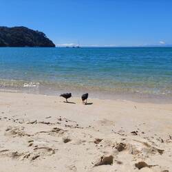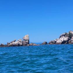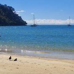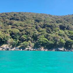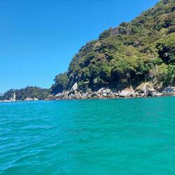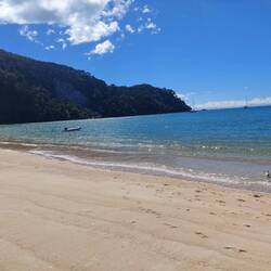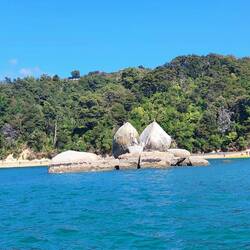 Zuerst gings mit dem Wassertaxi bis zur Bark-Bay, mit einem Abstecher am Split-Apple-Rock vorbei. Dort angekommen konnten wir erst einmal den Strand geniessen und uns umziehen. Irgendwann traf dann auch die Morgen-Gruppe mit unseren Kayaks ein. (Sie gingen von der Bark-Bay mit dem Wassertaxi zurück und wir übernahmen die Kayaks, sowie den Guide).