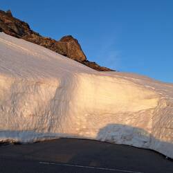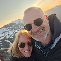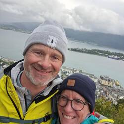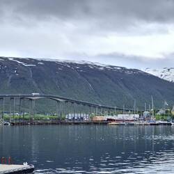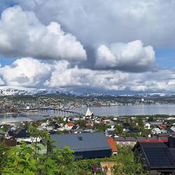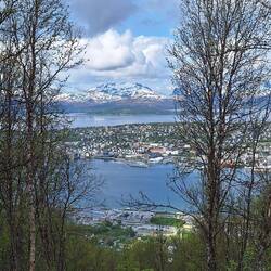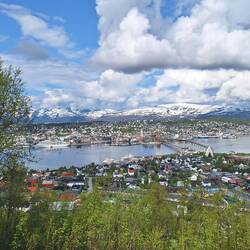 Die helle Nacht war für mich recht erholsam für Roman weniger. Aber sicher nicht, dass es zu hell war, die Vorhäge haben alles super "abgefangen". Gestärkt haben wir uns am riesigen Zmorgenbuffet. Die Auswahl ist gigantisch. Eigentlich wollten wir heute mit der Gondel Fhelheisen auf den Hausberg Storsteinen um ein wenig zu wandern und die gigantische Aussicht zu geniessen. Leider ist die Bahn bis Juli nicht in Betrieb, Revision. So haben wir beschlossen hinauf zu laufen. So haben wir die Wandersachen montiert und uns Richtung Tromsdalen gemacht. Um nach Tromsdalen zu kommen, mussten wir die Tromsøbrua überqueren. Die Tromsø-Brücke (norwegisch „Tromsøbrua“) ist eine Straßenbrücke in der nordnorwegischen Stadt Tromsø, die über den Tromsøysund führt. Die Brücke verbindet das Zentrum der Stadt auf der Insel Tromsøya mit dem Tromsøer Stadtteil Tromsdalen auf dem Festland. Mit einer Länge von 1036 Metern und höchster Punkt von 36 Metern war das Bauwerk nach seiner Fertigstellung im Jahr 1960 Nordeuropas größte Spannbetonbrücke. Die leicht bogenförmige Balkenbrücke mit ihren schlanken Säulen diente als Vorbild für nachfolgende Spannbetonbrücken in ganz Norwegen. Den Hausberg wollen wir über die Sherpatreppe erklimmen. 1300 Steinstufen verbinden den 85 Meter über dem Meeresspiegel gelegenen Fløyvegen mit der 421 Meter hohen Bergstation der Fjellheisen-Seilbahn. Das Wetter ist super für eine Wanderung. Der Aufstieg ist doch sehr happig. Ich schaffe nur 650 Stufen, danach muss ich wegen der Höhe kapitulieren (mussten sogar noch bei Schneefelder vorbei). Die Aussicht war auch sehr schön aber sicher nicht gigantisch. Aber was solls. Runter war auch kein Zuckerschlecken. Morgen können wir sicher fast nicht mehr laufen 🤪. Punkt 12.00 Uhr ertönte noch eine Sirene. Zuerst erstaunt, dann etwas erschrocken (Einheimische reagierten nicht) und zuletzt Blick aufs Handy, dass heute Sirenentest ist. Hätten wir das auch...
