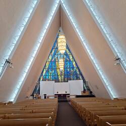 Wieder unten haben wir im Eurospar etwas zum Zmittag eigekauft. War lecker. Während dem Essen wurde der Himmel rundum sehr dunkel.... schnell in die Eismeerkathedrale (norwegisch: Ishavskatedralen). Sie ist eine moderne Kirche, erbaut in den 1960ern, mit einer ungewöhnlichen Architektur, die an einem Eisberg erinnert. Die grossen Fenster durchfluteten die Kirche anfänglich mit so viel Licht, dass die Messebesucher geblendet wurden. Daraufhin liess man Buntglasfenster einsetzen vom berühmten Glaskünster Viktor Sparre. Diese bilden eines der grössten Glasgemälde Europas mit insgesamt 86 rechteckigen Feldern.