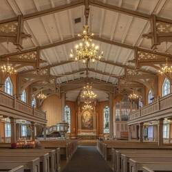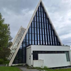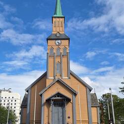 Die im Jahr 1965 eingeweihte Eismeer-Kathedrale erinnert in ihrer äusseren Form an die Trockenfisch-Gestellt, denen man an den Küsten des Nordmeers überall begegnet. Aber auch Polarnacht, Mitternachtssonne und Nordlicht soll der futuristisch wirkende Bau symbolisieren, der von Jan Inge Hovig entworfen wurde, doch von innen nicht unbedingt hält, was er von aussen verspricht. Nur das 140m2 grosse Glasmosaik, dass das 23m hohe Dreieck der Chorseite mit dem Motiv von Christi Wiederkunft ausfüllt, ist wirklich originell zu nennen.