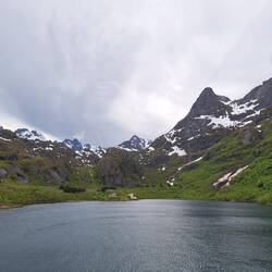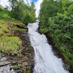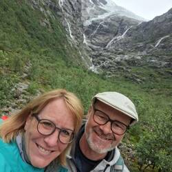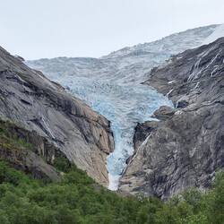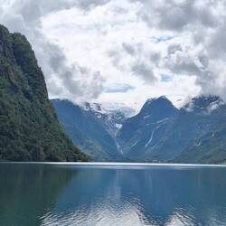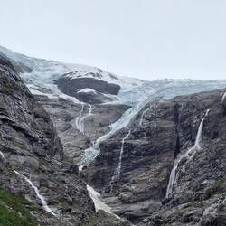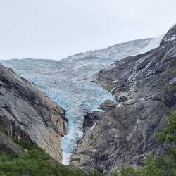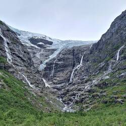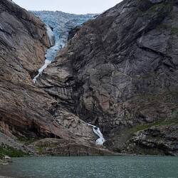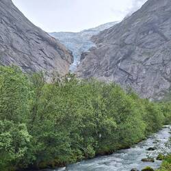 Jetzt gehen wir mit dem Auto ein Tal weiter. Vorbei an den See Floen und Oldevatnet. Auch hier sind die Strassen schmal und es hat einen ganz kriminellen Tunnel, also besser gesagt eine Röhre ohne Licht und Gegenverkehr nicht möglich. Also mir ist das Herz fast stehen geblieben. Draussen haben wir gemerkt dass der Gegenverkehr aussen am "Rohr" vorbei fährt 😱. Auch hier fahren wir bis es nicht weiter geht. Hier nehmen wir den Weg zum Briksdalsbree Gletscher, ein westlicher Nebenarm des größten Festlandgletschers in Europa, des Jostedalsbree. Es ist ein wunderschöner Weg auch vorbei an einem geossen Wasserfall. Oben angekommen, wow, Gletschersee und hinten der Gletscher. Ich bin hin und weg. Sogar einem kleinen Gletscherabbruch können wir zuschauen. Wir verweilen und geniessen.