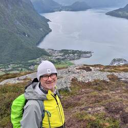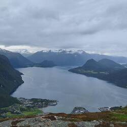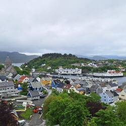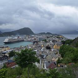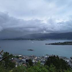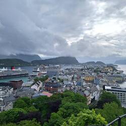 Da es regnet, fahren wir einen grossen Teil mit dem Auto, die letzten 2 Kilometer machen wir zu Fuss. Ein wunderschönes Gebiet zum Wandern. Oben geniessen wir die Aussicht und wollen uns im Restaursnt einen Kaffe gönnen. Wird nichts daraus - geschlossen 🥴. Jänu dann halt wieder runter zum Auto. Dort genehmigen wir uns etwas Käse und Tomaten. Jetzt geht es weiter nach Ålesund. Dafür benutzen wir, diese Ferien, das erste mal eine Fähre. Einreihen, warten bis alles runter sind, rein fahren und schon legt sie für die 30 minütige Überfahrt ab. Ratzfatz. Nach der Überfahrt fahren wir bis Ålesund noch eine Stunde. Ganz gemütlich und kein Stress, den heute hat das Wetter, so glauben wir, beschlossen nur einmal zu regnen. In Ålesund finden wir unser Hotel, dank Google, mitten im Sentrum, sofort. Einchecken, Auto in der Pakrgarage parkieren und dann ein kleines Cabaret. Wie funktioniert denn das mit dem Zahlen ohne Schranke und Billett? Wieder Google sei Dank, mit dem Übersetzer kriegen wir es auf die Reihe, noch kurz App runterladen u sere Autonummer hintlegen und rauf auf Zimmer. Etwas sein und schauen was wir noch anstellen wollen. Ach ja, ein Restaurant für den Abend habe ich auch noch reserviert (Empfehlung aus Reiseführer). Raus aus dem Hotel, oh man es schüttet wie aus Kübeln. Also rein in einen Souvenirshop und einen Schirm kaufen. Raus auf die Strasse und Schirm auf und Schirm sofort wieder zu. Es schüttet und windet so stark, dass die neue Errungenschaft sofort kaputt wäre. Also Kapuze auf und los. Wir wollen das garstige Wetter in einem Kaffee überbrücken (alle denken das gleiche). Aber auch wir finden schlussendlich ein Plätzchen, in welchen wir einen Dessert und einen Cappuccino geniessen können. Etwas später schlendern wir durch die Strassen und und zum Hafen (drei grosse Kreuzfahrtschiffe warten dort auf die Weiterfahrt). Das Wetter wird immer besser und wir haben noch Zeit bis zu unser Nachtessenverabredung. Also durch den Byparken (schöner Park, gleich hinter unserem Hotel) und rauf auf den 189 Meter hohe Ausichtsberg / Hausberg Aksla. Vom Byparken aus führen 418 Stufen rauf. Diese Norwegen haben es irgendwie mit Stufen 🤔. Oben geniessen wir die fantastische Rundumaussicht. Runter in.die Stadt haben wir einen schönen, fast ohne Treppen, Weg gefunden. Wieder im Zimmer machen wir uns für das Nachtessen schick. Heute speisen wir im XL Diner. Dieses Restaurant liegt direkt am Kanal und bietet moderne und kreative norwegische Küche. Es war super lecker. Ich habe "Bagalhau com Natas" probiert und Roman "Local Con and Salmon". Der kurze Verdauungs-Nachhause-Spaziergang hat gut getan. Im Zimmer habe wir festgestellt, dass es bereits 22.00 Uhr ist. Man verliert total das Zeitgefühl weil es immer noch so hell wie z.B. um.19.00 Uhr ist. Wir schauen noch kurz was wir morgen anstellen und danach ist Bettruhe.