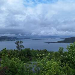Heute sind wir früh augestanden und haben uns am Buffet bedient. Wieder im Zimmer haben wir alles zusammen gepackt und haben ausgecheckt. Alles rein ins Auto - ups Olaf hat ein zu kleiner Kofferram. Sitze runter dann geht es. Wir fahren über die Atlantikstrasse nach Molde. In Molde wollen wir rauf zum Aussichtspunkt Varden (407 m ü.M.). Vom Berg aus hat eine Aussicht auf Molde, den Fjord mit Holmen und das berühmte Moldepanorama mit 222 teilweise schneebedeckten Gipfeln.