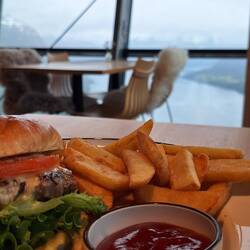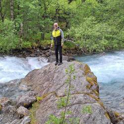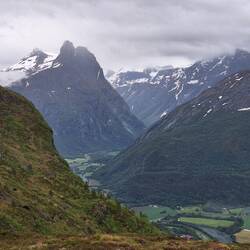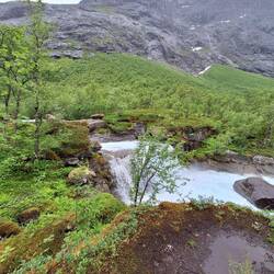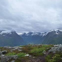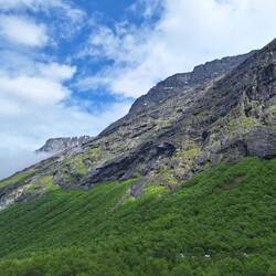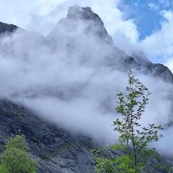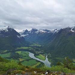 Heute morgen konnten wir uns wieder an einem riesigen Frühstücksbuffet die Bäuche vollschlagen. Mh alles sehr lecker. Heute fahren wir wieder mit Olaf umher. Roman hat sich schon fast in ihn verliebt. Unser Ziel ist Åndalsnes. Dort suchen wir uns einen Parkplatz und laufen zur Talstation der Romsdalengondel. Bitte zwei Tickets rauf und runter. Sie bringt uns auf 708 Meter über Meer. Selbstverständlich könnten wir auch rauflaufen, aber nicht heute. Wir wandern oben etwas umher. Rundum hohe Berge und die Sicht auf das Tal und das Wasser. Wunderschön. Die Wanderweg sind sehr schön angelegt und gepflegt. Zur Belohnung essen wir im Restaurant zusammen einen Angusburger. Wieder unten im Tal gehts mit Olaf Richtung Trollstigen. Trollstigen ist eine berühmte Passstrasse in Norwegen, bekannt für ihre elf Haarnadelkurven und die atemberaubende Landschaft. Leider konnten wir die Haarnadelkurven nicht fahren, aufgrund eines erhöhten Risikos von Steinschlägen waren umfangreiche Felsrutschschutzarbeiten auf dem Trollstigen erforderlich und die Strasse ist bis Mitte Juli gesperrt. Die Natur ist eindrücklich und wunderschön. Nicht hin und wieder weg, sondern geniessen, wir wandern einen schönen aber sehr nassen Rundweg. Leider begleitet uns auch heute der Regen fast den ganzen Tag. Wieder beim Auto machen wir uns an die Rückfahrt nach Ålesund.