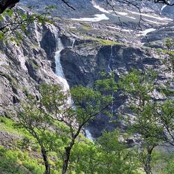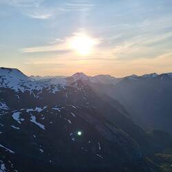 Heute verspricht die Wetterapp einen gigantisch schönen Tag. Nach dem Frühstück richten wir uns für eine Wanderung, aber gaaaaanz langsam, denn die Sonne will noch nicht so ganz. Irgendwann gehen wir, auch ohne Sonne, raus. Die Wanderung zum Storsæterfossen-Wasserfall ist schön und wieder sehr gut ausgebaut, auch wieder mit ganz vielen Steintreppen (welche von Sherpas im 2014 raufgeschleppt wurden). Ja ich glaube, ich habe nach den Ferien eine Phobie gegen Treppen. Oben angekommen (mit ganz vielen Touris) ist die Aussicht gigantisch. Roman geht noch zum Wasserfall, das Highlight ist, dass man hinter durch laufen kann. Nach einer kurzen Pause geht es für uns wieder runter. Jetzt nehmen wir die "alte Route". Etwas mehr abenteuerlich. Bei Westerås Restaurant setzen wir uns aus die Terrasse mit herrlicher Aussicht auf die Berge und den Fjord. Wir genehmigen uns einen feinen Salat und ein Mozzarella-Tomaten-Sandwich. Zum Abschluss noch eine sooo feine Waffel mit Glace. Wieder gestärkt, laufen wir noch zum Aussichtspunkt. Also Roman, ich habe wegen dem Weg, aufgegeben. Zusammen sind wir dann wieder zurück ins Hotel, wo wir uns auf dem Zimmer einen feinen Kaffe gegönnt haben. Etwas ausruhen und Beine hochlagern und dann richten wir uns für den Abend. Wir nehmen Olaf und fahren runter ins Zentrum von Geiranger. Wir suchen uns eine Bank und geniessen die Sonne und die angenehmen Temperaturen. Einfach sein bis um 20.00 Uhr, bis wir unsere Reservierung in der Brasserie Posten hatten. Heute habe wir zum feinen Essen {Wrap und Beefburger) ein lokales Geiranger Bier genossen. Das heute das Wetter so wundervoll ist, beschliessen wir noch zum 16 Kilometer entferneten Aussichtspunkt Dalsnibba zu fahren. Wir haben heute morgen gesehen wieviele Cars sich dorthinauf gekämpft haben, nein danke, heute Wetter- und Menschentechnisch viel die bessere Option. Also jagen wir Olaf die Passstrasse rauf auf 1500 Meter über Meer. Dlasnibba ist die höchste mit dem Auto erreichbare Fjordaussicht Europas mit Blick auf den Geirangerfjord und auf die schneebedeckten Gipfel.
