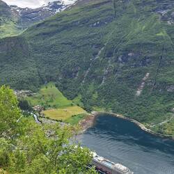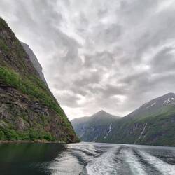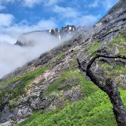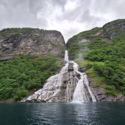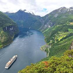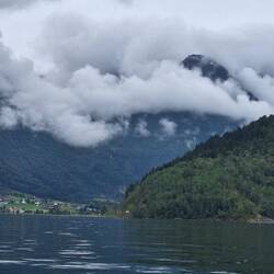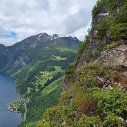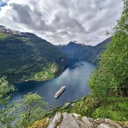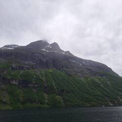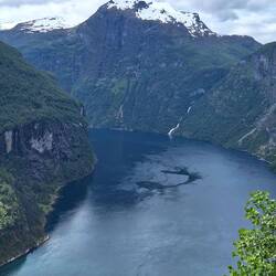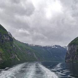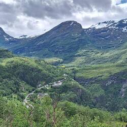 Auf dem Weg habe wir den Eiksundtunnel durchfahren. Dieser Tunnel ist 7765 m lang und war mit einer Tiefe von 287 Meter unter Meer bis zur Eröffnung des Ryfylketunnels 2019 der tiefste Straßentunnel der Welt. Die größte Steigung im Tunnel beträgt 9.6%. Auf dem Navi haben wir gesehen, dass wir unter Wasser und unter oder durch Inseln fahren bis wir wieder Tageslicht sehen. Sehr speziell. Die Fahrt ist gespickt von wundervollen Aussichten. In Stryn machen wir einen Stop. Ein wirklich schmuckes Städtchen. Auf einer Bank, bei milden Temperaturen 16 Grad, essen wir unsere Brötchen und Früchte. Von hier aus sind es noch 1,5 Stunden bis zu unserem Hotel in Geiranger. Bald geht es aufwärts, ein Pass (ungefähr 1000 Meter über Meer) wie wir es von der Schweiz kennen. Überall noch ganz ganz viel Schnee und viele Kurven. Viele Kurven später kst inmitten einer Kurve oberhalb vom Fjord, unser Hotel Utsikten (wurde 1893 erbaut und verfügt heute über 29 kleine, schmucke Zimmer). Von unserem Zimmer haben wir einen herrlichen Blick auf den Fjord und den Schiffsverkehr (in der Hochsaison 6000 Personen pro Tag mit den Schiffen). Bevor wir um 1700 Uhr auf unsere Fjord Schifffahrt gehen, geniessen wir in unserem Zimmer einen Kaffee und etwas Zeit zum lesen. Heute hat es verhältnismässig wenig geregnet. Für auf das Schiff haben wir uns warm warm eingepackt (Unterleibchen, zwei Langarmshirts, ein Jäckchen, Daunenjacke und die Regenjacke, Kappe, Leggins und Wanderhose) auf die 90 minütige Fjord Schifffahrt gefreut. War sehr spannend und eindrücklich. Wie auch die Leute bis 1961 an Orten (in Felswand) gehaust und Landwirtschaft betrieben habe, wo es heute nicht vorstellbar ist. Es ist wirklich ein wundervoller Ort. In Fotos ist es gar nicht möglich diese Magie einzufangen. Wieder an Land sind wir noch durch die Souvenirshops geschlendert und dann mit Olaf wieder rauf zu unserem Hotel gefahren. Im Zimmer kurz schick machen und dann eunter ins Restaurant. Wir haben uns für Geiranger Lachs mit Blumenkohlpüree und Gemüse und danach für einen feinen Dessert entschieden. War mega fein. Jetzt regnet es stark und wir freuen uns auf morgen, hoffentlich wie vorausgesagt, auf schönes Wetter.