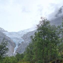 Heute haben wir, nach Aussage von Roman, ausgeschlafen. Nach dem Frühstück haben wir entschieden, dass wir das ewige Eis näher betrachten möchten. Auch hat uns unsere Reiseberaterin vorgeschlagen am See Lovatnet entlang zu fahren. Also fahren wir einfach mal los. Einfach wunderschön, die Landschaft und der See hat eine spektakuläre Farbe. Die Strasse ist auch wieder recht spektakulär oder manchmal sogar kriminell. Wir fahren einfach bis wir den Gletscher Kjenndalsbreen sehen. Der 19 Quadratkilometer große Gletscher ist ein Seitenarm des Jodtedalsbreen und gehört zum Jostedalsbreen - Nationalpark. Bei einem Aussichtspunkt parkieren wir Olaf und nehmen die letzten Kilometern noch zu Fuss. Vor der gigantischen Aussicht nehmen wir auf einer Bank Platz und geniessen diese. Bis es anfängt etwas zu regnen. Also gehen wir wieder retour zu Olaf. Jetzt fahren wir bis zum nächsten Haus, das Restaurant Kjenndalstova. Da es Mittag ist und Roman einen Hunger verspührt, fragen wir noch einem Mittagessen. Leider nein, die Küche ist heute geschlossen. Aber Dessert haben sie. So gibt es für jeden von uns einen Cappuccino und einen sehr leckeren Apfelkuchen Auf die Frage von Roman, wo denn die Äpfel angebaut werden (heir bekommt man auch überall Apfelsaft), ist die Antwort, dass es in Loen eine Plantage hätte. Auf dem Heimweg haben wir sie auch tatsächlich gesehen (jö, so herzig).