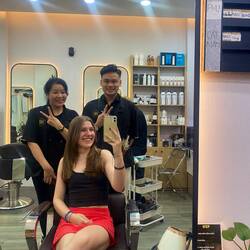 Sie bekommt eine Haarwäsche mit Kopfmassage und dann kommen die kaputten Haare ab, mit Beratung des Friseurs dann noch Bangs und Stufen rein und fertig ist der neue Haarschnitt.
