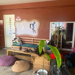 Das Hostel ist sehr nett mit einzelnen Bungalows und einem Essbereich im Freien- indem wir tatsächlich sehr viel Zeit verbringen werden in der nächsten Woche.