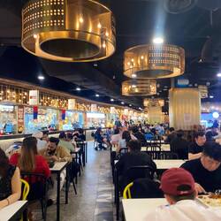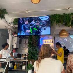 Direkt um die Ecke ist ein Restaurant das Formel 1 auf mehreren Bildschirmen zeigt.
