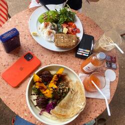 Vorher stärken wir uns neben unserem Hostel in einem Café und dann geht es los zum Treffpunkt .
