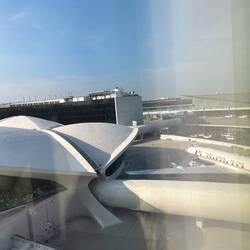 The motel room overlooks the main TWA terminal. We can see the Constellation aircraftLeer más