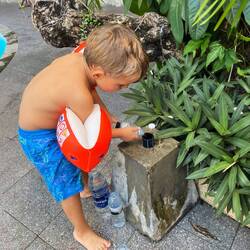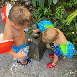 Es ist echt witzig, dass die zwei jeden Tag aufs Neue Spielideen mit leeren Plastikflaschen und ihren Schuhen am Pool entwickeln - vom Bootsbau und -rennen bis zum Wasserfiltern.
