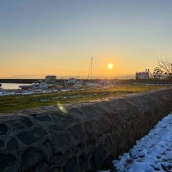 Die Kinder haben mit großer Freude draußen mit Schnee und Eis gespielt. Wir sind dann noch kurz um die Ecke gelaufen und dort haben sie Eisplatten vom Straßenrand ins Meer geworfen - je größer desto besser und hätte für sie auch noch etwas so weitergehen können, aber für mich nicht, da es nach dem wunderschönen Sonnenuntergang noch kälter wurde.