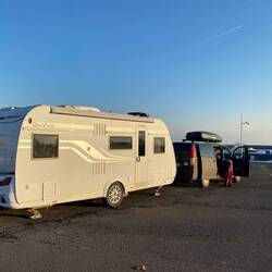 Ausschlafen, Frühstück, Wasser auffüllen, Toilette leeren, durchsaugen, alles wegräumen, mit dem Roller noch ein paar Runden drehen, Stützen hoch, anhängen, alle einsteigen, anschnallen, Tor aufschieben, Tor zuschieben, einen letzten Blick werfen, letzte Kontrolle, vom Wachwuffi verabschieden und Abfahrt. Homie stand hier jetzt mehr als einen Monat und glänzend geputzt geht er jetzt wieder mit uns auf Reisen.