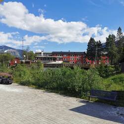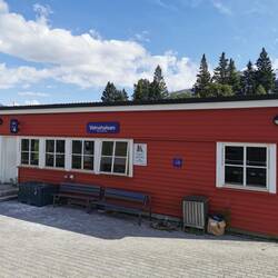 Vatnahalsen (811 m ü.NN, 19,1 km): Die Station des Vatnahalsen Hotels ist die Endhöhe fast erreicht, man hat aber noch einmal die Möglichkeit, tief ins Tal hinunterzuschauen.